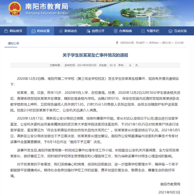 南阳市教育局9月3日在其官网上通报,2020年12月2日晚,南阳市第二中学校(第三完全学校校区)发生学生张某某坠楼事件,现将有关情况通报如下: