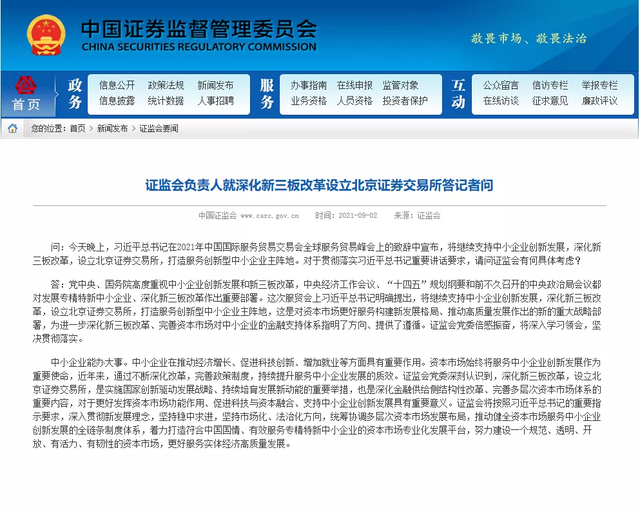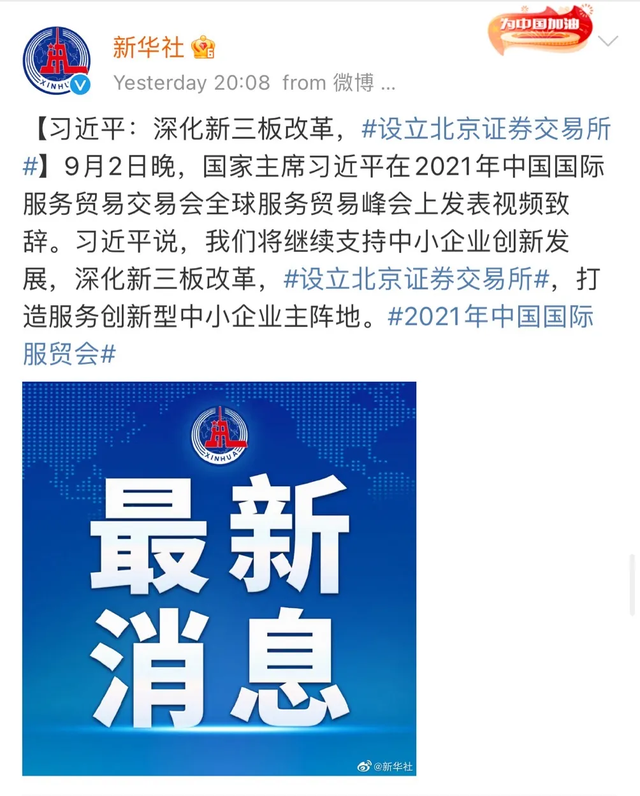 9月2日晚,国家主席习近平在2021年中国国际服务贸易交易会全球服务贸易峰会上视频致辞时表示,将继续支持中小企业创新发展,深化新三板改革,设立北京证券交易所,打造服务创新型中小企业主阵地。