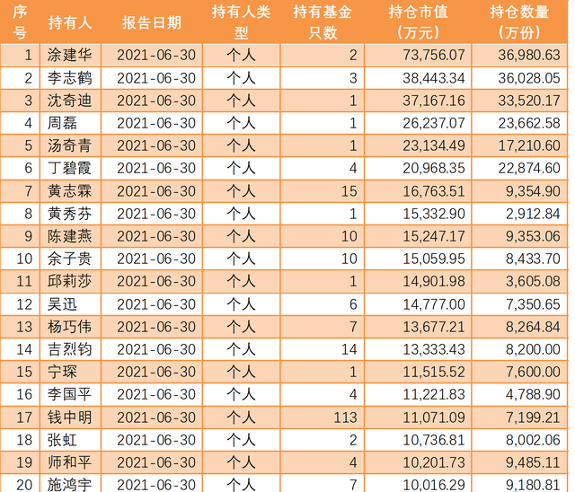 大家在惊呼的同时,可能还不知道,在基金市场,还有不少持基过亿的个人投资者,从截至6月底的数据统计来看,有6位个人投资者的持基金额超过了2亿元,有20位个人投资者的持有金额超过1亿,具体如下: