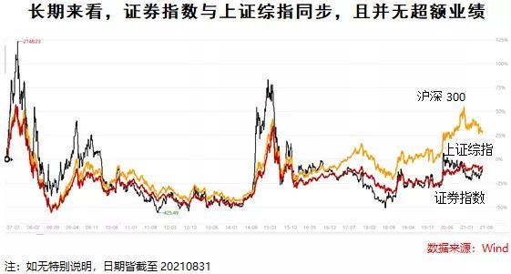 图1 长期看,证券指数与上证综指同步,且并无超额业绩