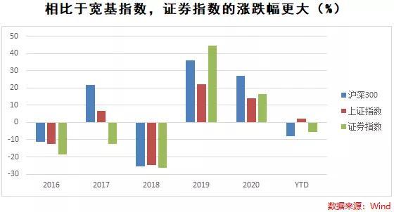 图2 相比于宽基指数,证券指数的涨跌幅更大(%)