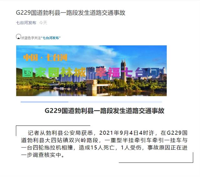 4日上午11时许,七台河发布官微发布信息说,据从勃利县公安局消息,2021年9月4日4时许,在G229国道勃利县大四站镇双兴岭路段,一重型半挂牵引车牵引一挂车与一台四轮拖拉机相撞,造成15人死亡1人受伤,事故原因正在进一步调查核实中。