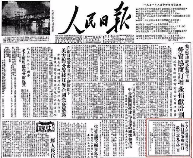 1951年8月14日《人民日报》刊登的将抗日战争胜利日改定为九月三日的通告截图