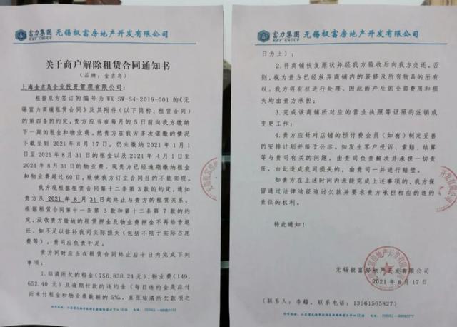 在无锡极富房地产开发有限公司张贴在该门店门口的通知书中,该公司宣布自8月31日起终止与金吉鸟的租赁关系,并要求其结清所欠的租金及物业费共计90万余元、完成商铺所对应的证照注销或变更等事项。