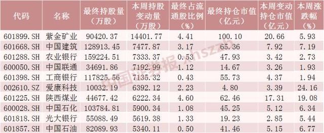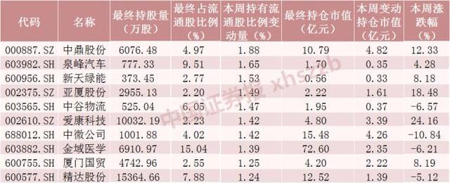 从市场表现来看,本周北向资金持有流通股比例增加的前十股票涨多跌少,中微公司跌幅最大,累计下跌10.84%,爱康科技涨幅最大。