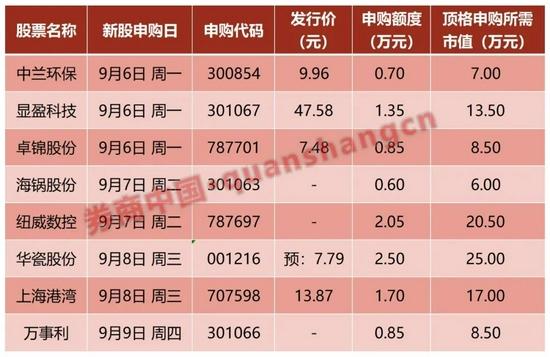 本周,一共有8只新股申购,其中周一3只,周二2只,周三2只,周四1只。上证主板上市的有卓锦股份、纽威数控、上海港湾,创业板上市的有中兰环保、显盈科技、海锅股份、华瓷股份、万事利。