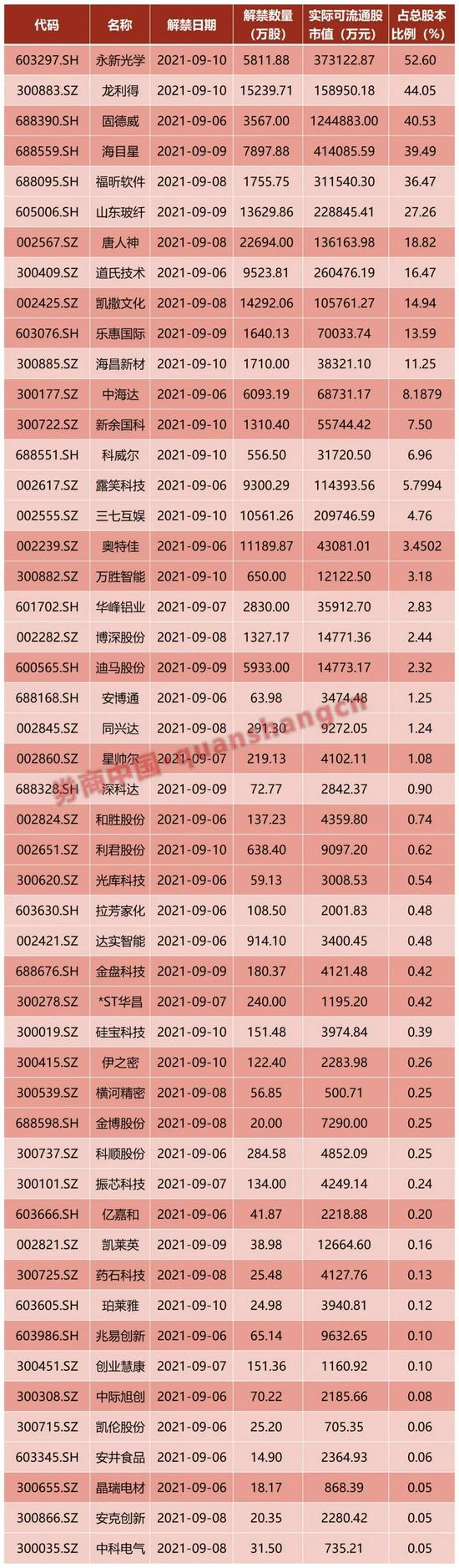 数据显示,本周(9月6日至10日),沪深两市限售股上市数量共计15.17亿股,市值约为405亿元,较上周环比降近7成。本周限售股数量超1亿股的公司仅有4家,分别是唐人神、龙利得、凯撒文化、奥特佳。
