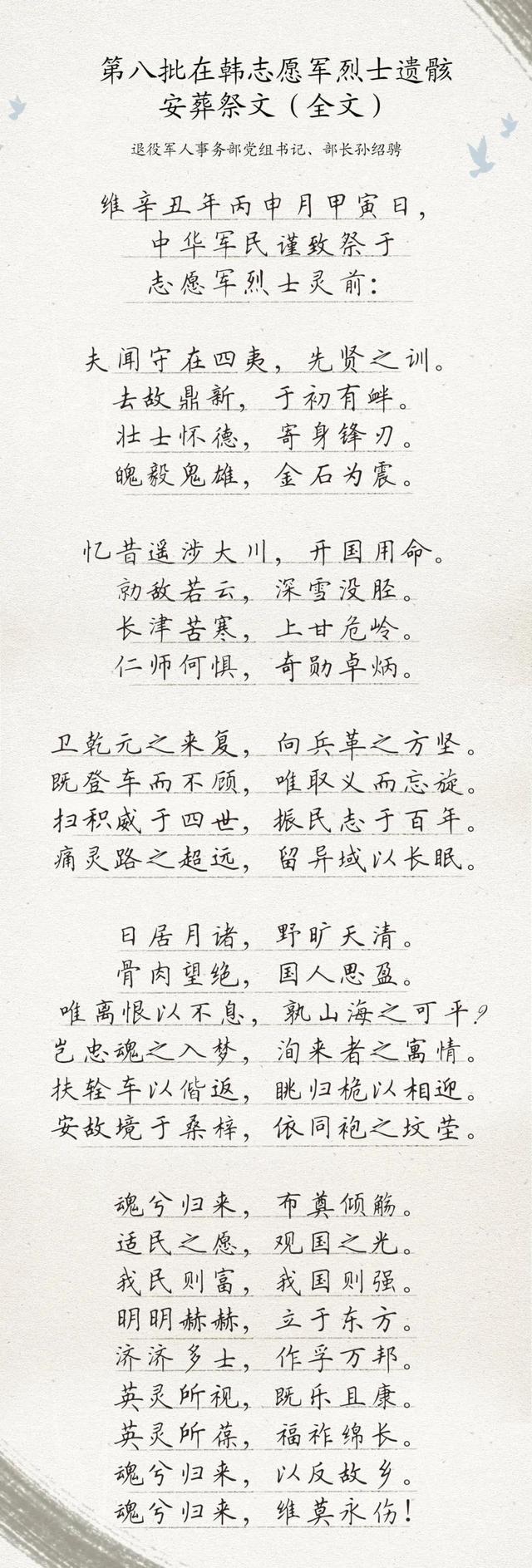 1.《解读志愿军烈士遗骸安葬祭文的背后深意》援引自互联网,旨在传递更多网络信息知识,仅代表作者本人观点,与本网站无关,侵删请联系页脚下方联系方式。