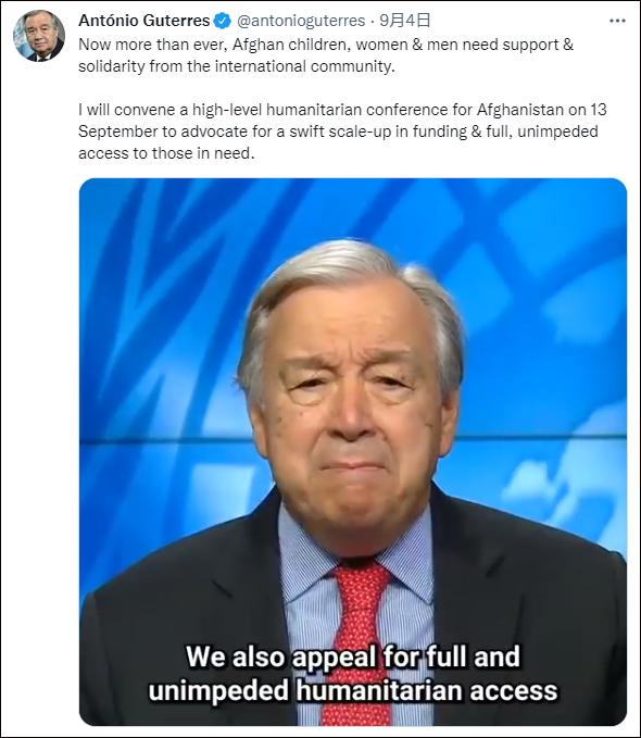 在9月4日发布在推特的一段视频中,联合国秘书长古特雷斯呼吁国际社会在塔利班接管阿富汗后帮助该国。他在推特上警告称,阿富汗正面临“迫在眉睫的人道主义灾难”。