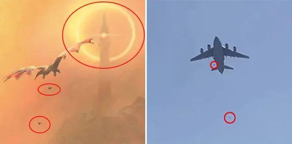 空中一条飞龙正向远处的高塔飞去,可以看见有两个人坠下,令人联想起早前美军从阿富汗喀布尔机场撤军时从运输机上坠下的两个人。