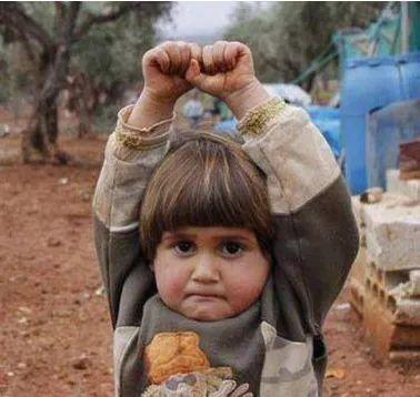 在这个角落里,还可以隐约看到一个举起手的小孩,她取自2014年拍摄的一张著名照片,这是一个名叫胡地亚(Hudea)叙利亚女孩,在面对摄影师的镜头时以为是瞄准的枪,连忙举起了双手。