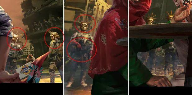 背景中四下已经变成废墟,大楼中站满了美军士兵,他们也戴着自由女神的王冠。