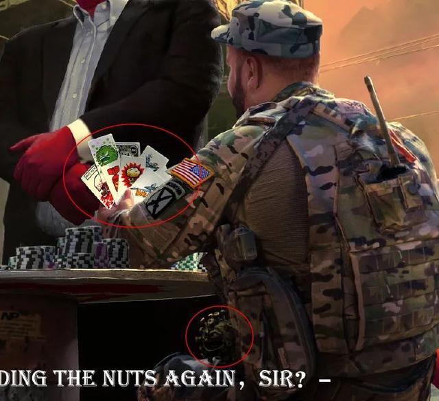 而对面的美军士兵手里有很多牌,包括病毒牌、核弹牌、轰炸牌、战机牌等等。美军士兵的身上还挂着一个新冠病毒模样的手雷。