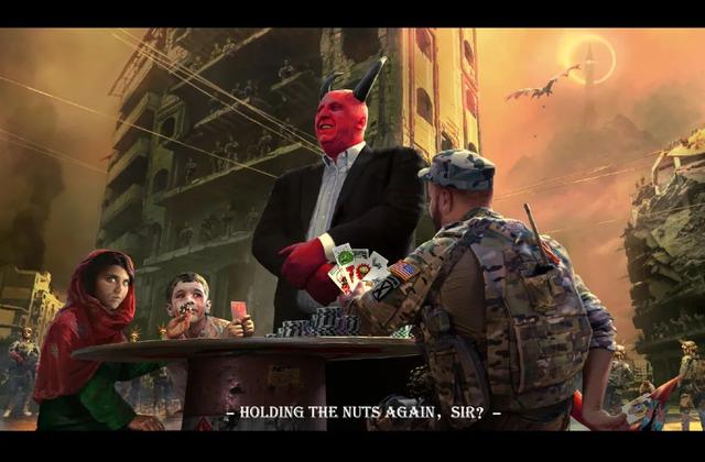 这幅画面中,入眼可以看到一张牌桌,中间站着一名红脸恶魔荷官,酷似地狱男爵,牌桌左边坐着一名少女和一名男童,牌桌右边是一名美军士兵。