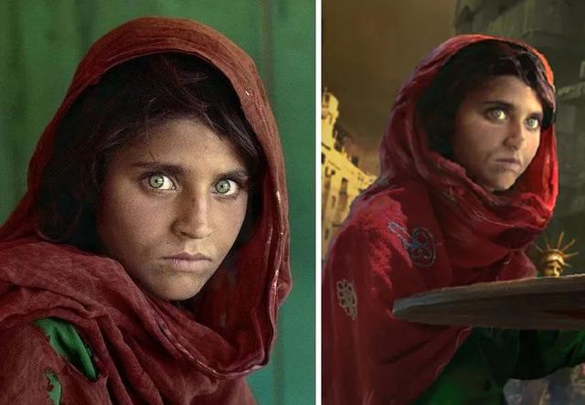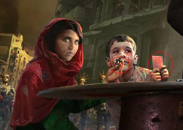 这位少女应该取自《国家地理》杂志1985年6月的著名封面照片“阿富汗少女”。这位男童可能是取自2016年8月网络上热传的叙利亚阿勒颇男孩奥姆兰·达纳什。可以看到女孩和男童手里只有一张牌和一个筹码。