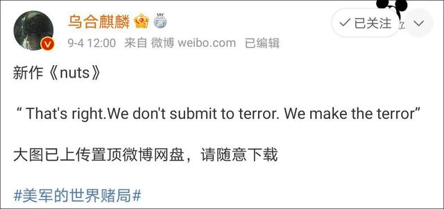 9月4日中午12点整,时刻关注国际热点的中国著名CG画师@乌合麒麟 ,通过微博发布了最新作品《nuts》 (好牌),并加上了话题#美国的世界赌局#。