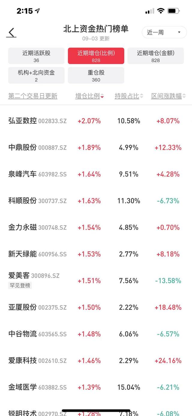 以增仓比例统计,本周共计828只个股获北上资金环比加仓;加仓幅度前100股中,电气设备、化工、医药生物股居多。个股中,弘亚数控获北上资金加仓最多,超过2%,也是仅有一只。