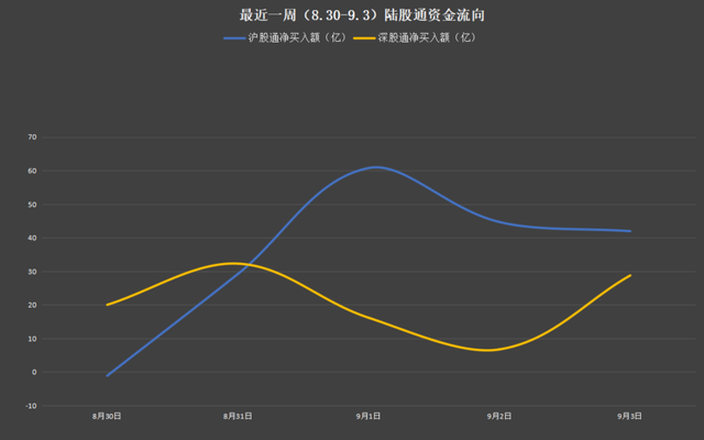 9月首周,北上资金呈现出大幅买入的态势,全周共计净流入约近280亿元,为近14周最高水平;其中沪股通本周净买入175.42亿元,深股通净买入103.85亿元。