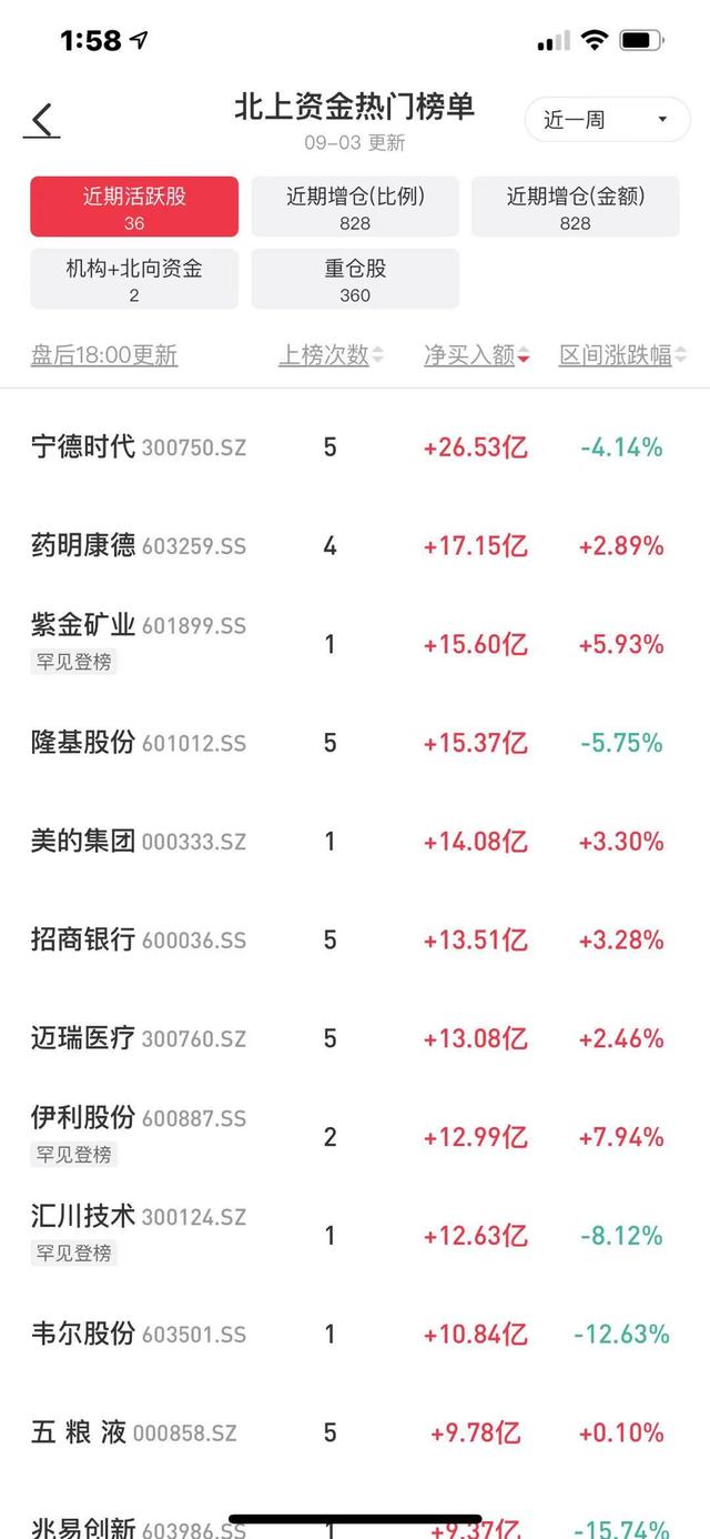 上周有36只个股表现活跃,其中有超10只个股净买入额超过10亿元,居前的有宁德时代、药明康德、紫金矿业、隆基股份、美的集团等;共性上看,北上资金又开始重新布局各行业的“茅”龙头。