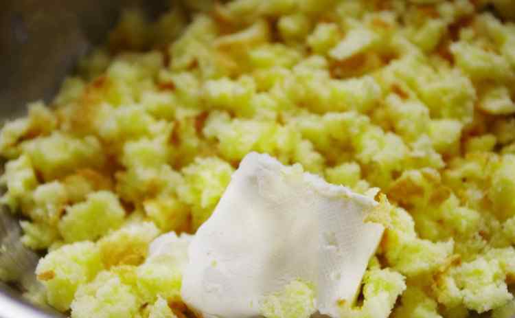 2 奶油奶酪室温软化后加入蛋糕碎末中