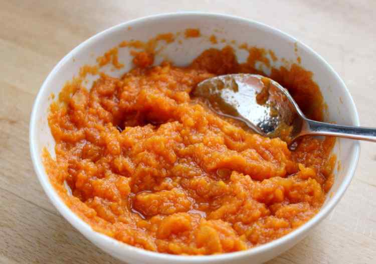 4 将红薯去皮煮熟或蒸熟,压成泥。