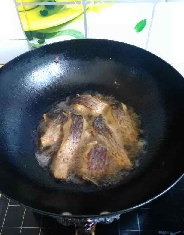 4 热锅凉油,油温烧制八成热开始放入鱼块炸制,先把鱼皮那面朝下炸到金黄再翻面,两面金黄后捞出,依次炸好所有鱼块。炸完后把腌鱼用的葱姜蒜单独留好,炒时再用。