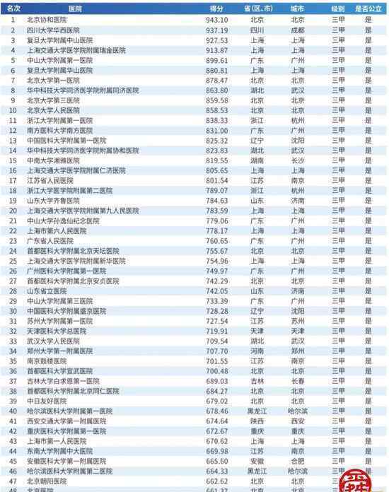 此次中国顶级医院100强的评价体系涵盖医疗技术、资源配置、医院运营、诚信服务和学术科研五大维度。2019届顶级医院100强是按照中国内地最佳综合医院排名,含中医医院,但不含专科医院和部队医院。肿瘤医院、儿童医院、妇产医院等专科医院则另有各自专科50强排名榜单。