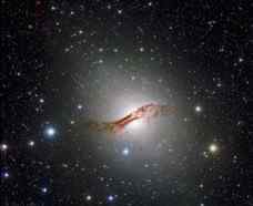 半人马座A距离我们1200万光年,主宰着它的星系团。这个巨大的星系发出可见光和无线电波段的强烈辐射。它之所以发出强烈的无线电辐射,可能与它在5亿年前吞噬了一个伴星系有关。