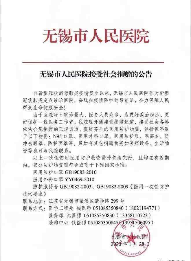 早在1月28日,无锡的几家大医院,包括无锡市人民医院,就开始接受社会捐赠。