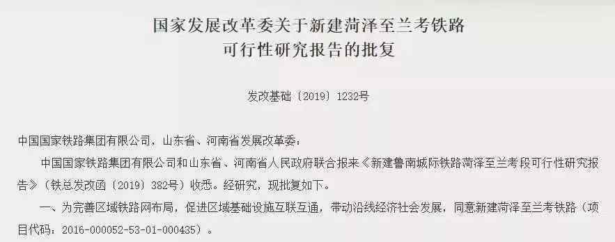 中铁股份有限公司与山东省、河南省人民政府联合提交了《鲁南城际铁路菏泽至兰考段可行性研究报告》(铁总发改函[2019]382号)。经研究,回复如下。