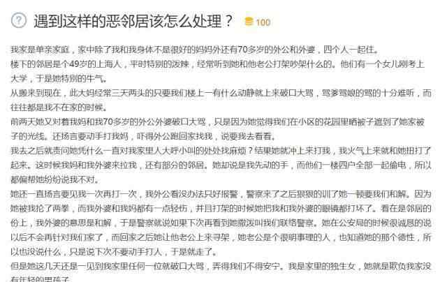 因为遇到了一个不好的邻居。说来好笑,她口中邪恶的邻居竟然是一位80岁的老太太,据说是退休老教师。他妻子几年前去世了。有一个五十多岁的女儿和她住在一起。