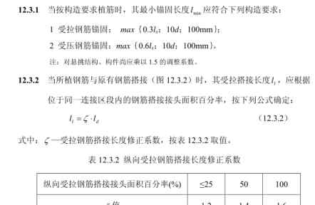 植筋的锚固深度是决定植筋效果关键因素之一。《混凝土结构加固设计规范》(GB50367-2013)中规定单根植筋锚固的承载力设计值应满足下列要求: