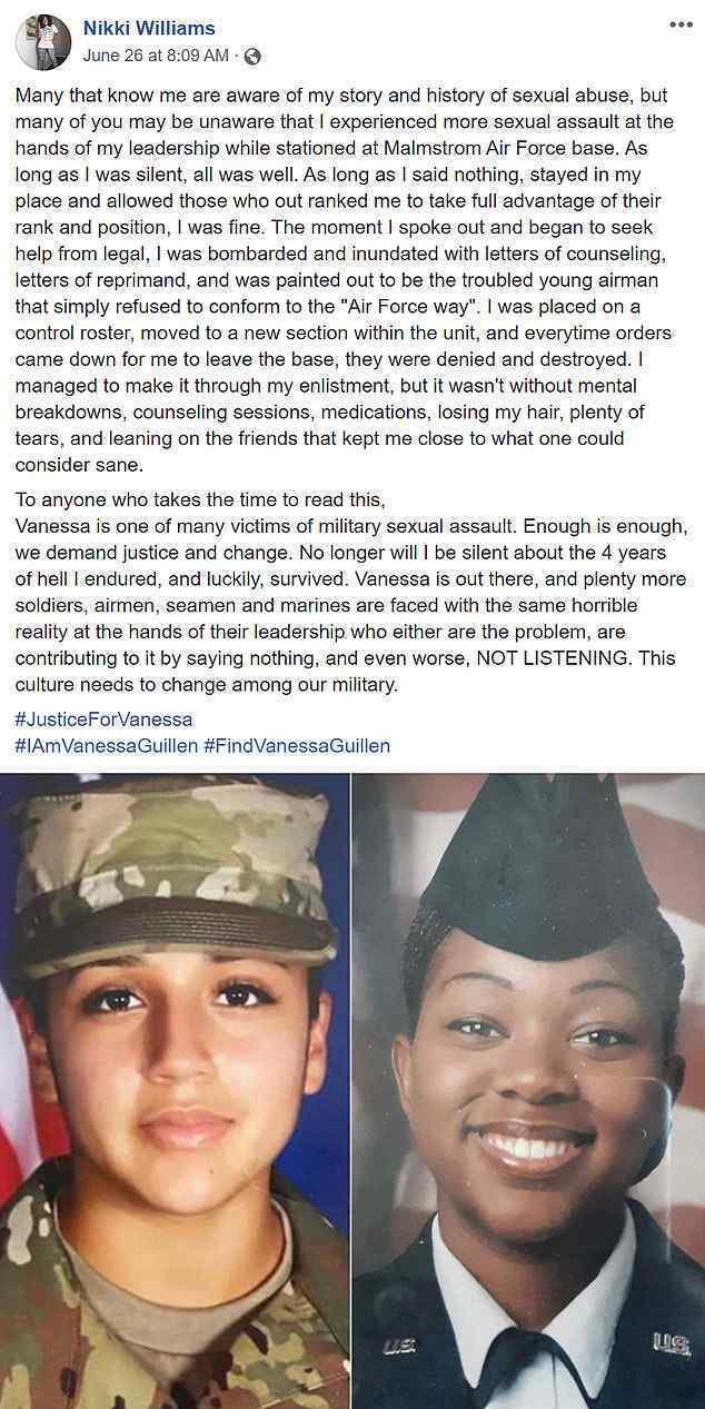 和凡妮莎一起驻扎在胡德堡的士兵之一贾斯敏告诉网友:2019年6月,她被同一基地的同事性骚扰。在朋友的鼓励下,她向上级汇报了情况。