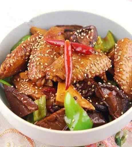 11.看到鸡翅又软又烂,汤也少,可以大火收汁。将甜椒切好,放入锅中翻炒。撒上白芝麻。