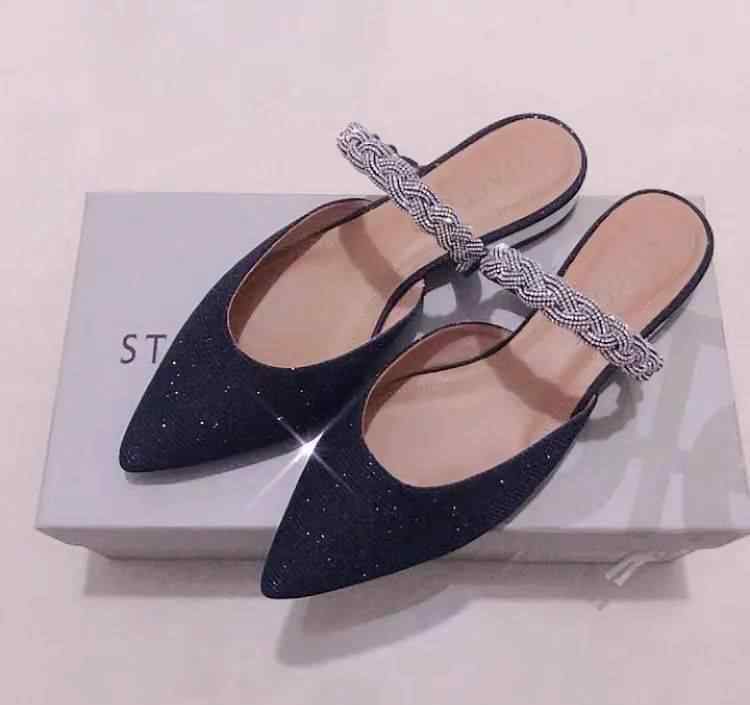 深蓝色闪光鞋面和银色表带的组合并不尴尬,搭配镜面平跟,让这双鞋在正式场合更休闲优雅~穿上脚后看起来很不错,而且因为是平跟或者很舒服,绝对是夏天搭配小裙子的最佳选择(≧ ▽ ≦)