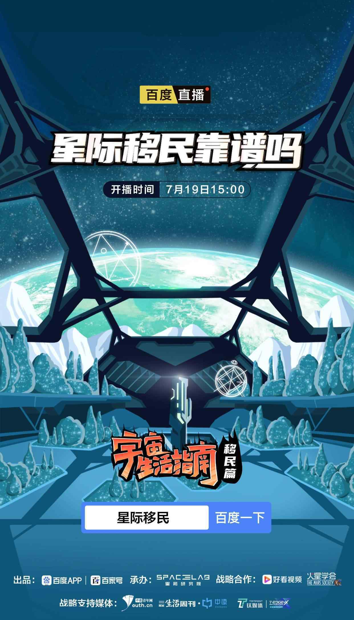 《宇宙人生指南》第二期将于7月19日15:00在百度APP上播出。这一次我们会更深入的说“星际移民靠谱吗?”讨论题目。当时只要打开百度APP,搜索“星际移民”就可以进入直播室。