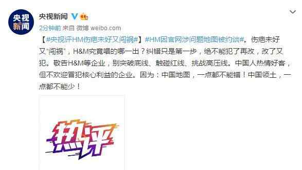 H&M因官网涉问题地图被约谈。伤疤未好又“闯祸”,H&M究竟唱的哪一出?纠错只是第一步,绝不能犯了再改,改了又犯。敬告H&M等企业,别突破底线、触碰红线、挑战高压线。中国人热情好客,但不欢迎冒犯核心利益的企业。因为:中国地图,一点都不能错!中国领土,一点都不能少!