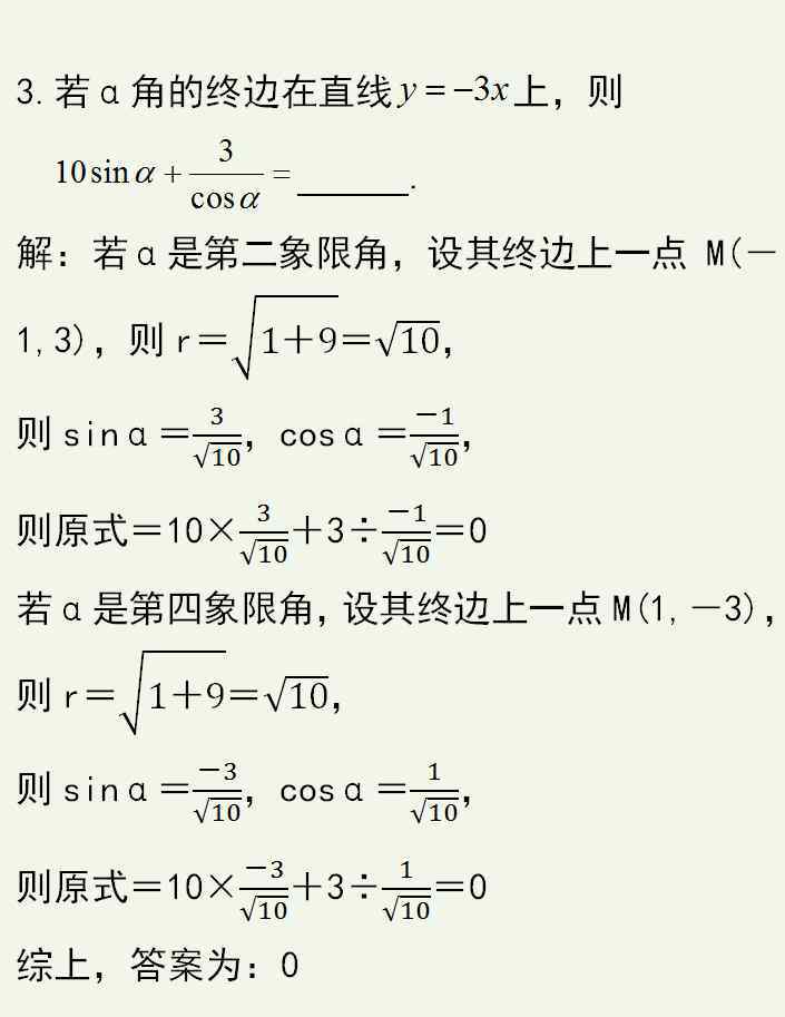 第三个问题分析:这类问题通常是根据问题的意思在角度的最后边缘设置一个特殊的点来解决。角α的最终边在直线y =-3x上,这意味着α是第二象限或第四象限。可以分两种情况来讨论,比如情况①:当α为第二象限时,可以在α的最终边上设置一个点m (-1,3)(注意第二象限点的横坐标为负);情况二:当α为第四象限角时,可以在α的最终边上设置一个点P (1,-3);然后求sinα和cosα的值,代入代数表达式。