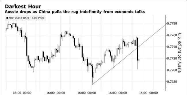 中方声明发布后,彭博社称,澳元汇率应声下跌出现“黑暗一小时”,兑美元汇率一度下跌0.6%,低至0.7701美元,随后回落至0.7724美元左右。此外,澳大利亚股市也受到影响,S&P/ASX 200指数下跌0.8%。