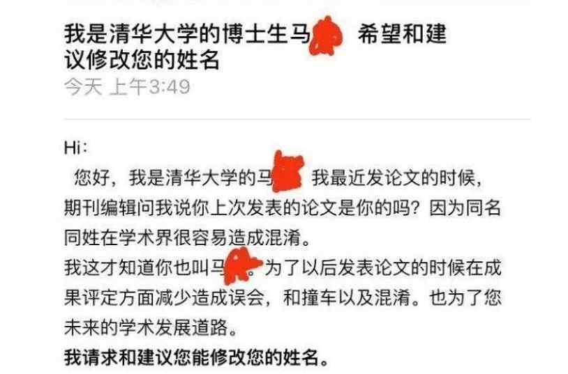 我想起去年的一件事,说清华有个博士生叫马。当他提交论文时,有人告诉他有人和他同名。于是他找到了那个同学的联系方式,给对方发了邮件,要求对方改名字!别人先来,我在后面,我也是醉了,但是我反过来要别人的名字。你有同名的人吗?