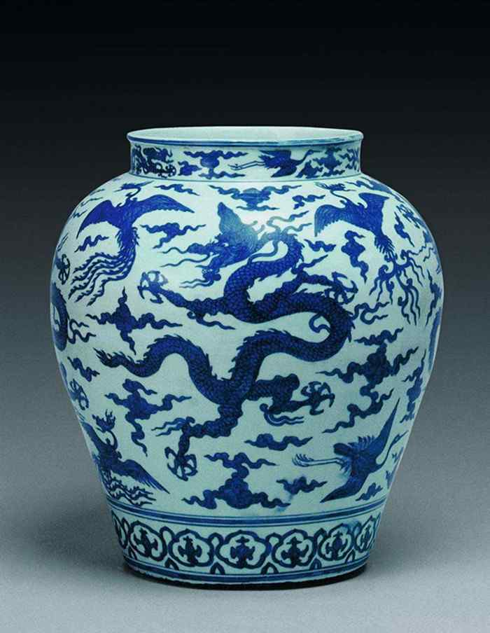 青花龙凤鹤罐是明代嘉靖时期的文物,1958年在南城县洪门水库亦庄王夫妇合葬墓出土,高22.0厘米,直径11.4厘米,底径10.3厘米。