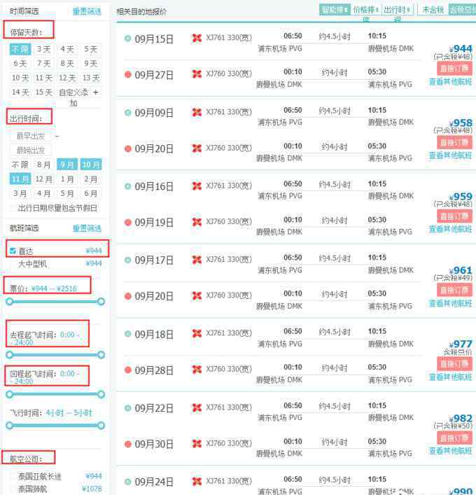 您可以选择停留天数、旅行时间、直达/中转、票价、飞行时间、航班空公司等等。