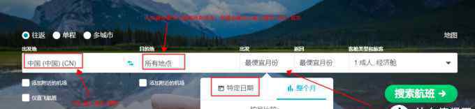 如果旅行目的地和旅行时间不确定,天空之旅上的“模糊查询”工具也很有用。可以直接找到最便宜时间段的“全国出发”、“所有日期”、“世界多个目的地”的价格。