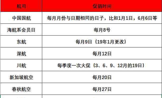 一些定期的促销活动包括,例如,每月9日的东航会员日,每月8日的海航会员日,新航最近把20号改成会员推广日,每个月28号南航会员日。