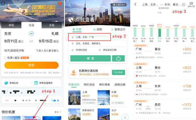 找到特价机票入口:打开携程APP-点击机票会场-点击下面的特价机票-点击查询。它还支持同时查询三个目的地和出发地点。将会有一个柱状图展示最近的低价。