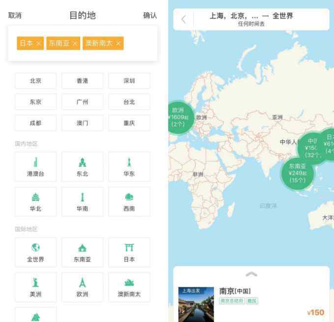 相比飞猪/去哪里,携程在目的地搜索上支持更多的地区/城市/国家,用地图显示更直观。比如东南亚、中东、非洲、欧洲/全世界基于地图的查询,一目了然。