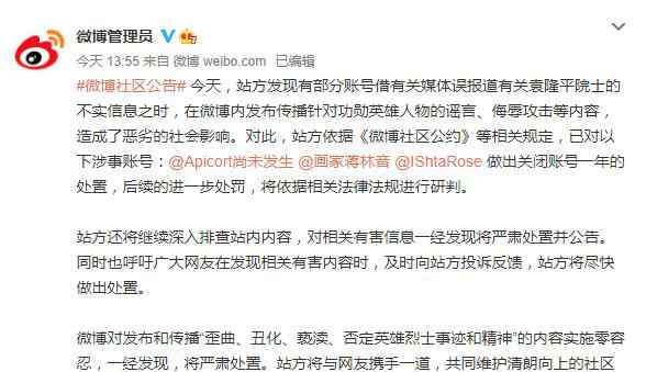 22日13时许,据@微博管理员,站方发现有部分账号借有关媒体误报道有关袁隆平院士的不实信息之时,在微博内发布传播针对功勋英雄人物的谣言、侮辱攻击等内容,造成了恶劣的社会影响。对此,站方依据《微博社区公约》等相关规定,已对以下涉事账号:@Apicort尚未发生 @画家蒋林音 @IShtaRose做出关闭账号一年的处置,后续的进一步处罚,将依据相关法律法规进行研判。