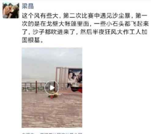 梁晶最后一条朋友圈发布于5月22日8点20分,他写道:“这个风有些大,第二次比赛中遇见沙尘暴,第一次的是在戈壁大帐篷里面,一些小石头都飞起来了,沙子都吹进来了,然后半夜狂风大作工人加固根基。”
