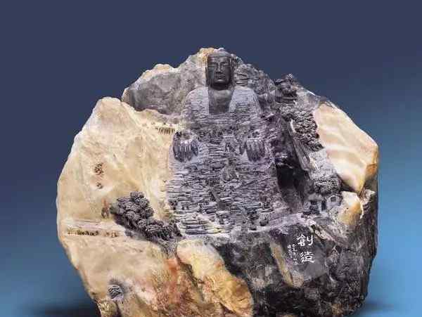 顾永军先生在设计这一大型碧玉山雕时,充分利用了其天然优美的玉形,因材施艺,挖土盖土,将雄伟的乐山大佛坐于画面中央。巍峨的云冈大佛、龙门大佛伫立山河旁,玲珑秀丽的大足石刻赫然耸立在山谷中。