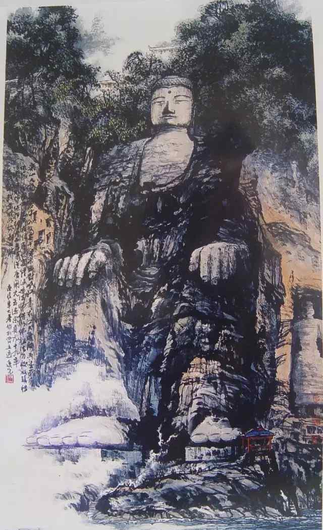 乐山大佛是在凌云山栖霞峰河边凿成的。画家为了形象地刻画其高大雄伟的形象,故意在佛像身前微微后仰,使他的乐山大佛面朝上,遥望峨眉,以示千年古佛守望人间沧桑。画家善于调动绘画、粉彩、水彩画、版画等绘画技法的积累,融合中国画的意境、西方绘画的写实与抽象风格、和谐的色彩对比、民间夸张与装饰。